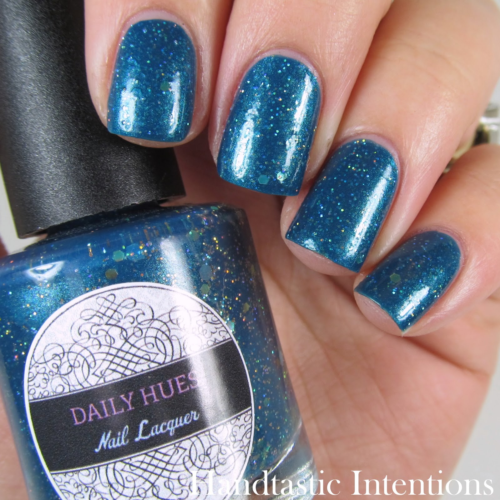 I know that I always say I am excited to share whatever polish I have to share with you, but today, I am the MOST excited I have been in a long time about a polish!! Daily Hues Nail Lacquer and I teamed up to create a polish and get this: she named it after me!! Andrea is a blue-teal based, full coverage crelly with holo glitter galore!